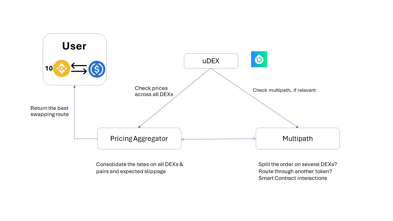 In its operation, uDEX connects to major decentralized exchanges, comparing rates across them to find the best trading conditions. The platform's routing algorithm strategically searches for the most favorable rates, often splitting orders across several exchanges, especially effective for large transactions. For example, in certain trades, the algorithm may choose a multi-step conversion process to ensure the best rate, illustrating uDEX's commitment to offering efficient, cost-effective trading solutions for its users.